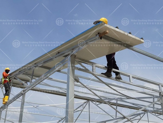 Steel structure poultry house is made of light weight steel structure, it's widely used for the chicken, sheep, cow, etc. The roof can be made of corrugated steel sheet or sandwich panel which has good insulation performance. The wall is built with steel mesh or sandwich panel. Both the wall and the roof have contributed to ensure an excellent insulation performance, therefore the shed is very resistant to wind, impact and climate change.